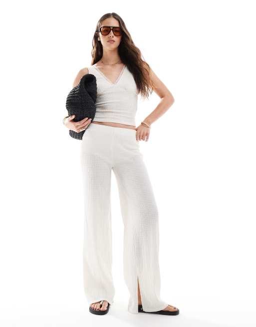 Bershka – Naturvita, utsvängda byxor med smockad design