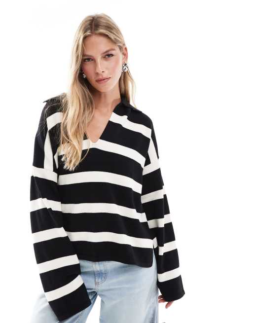 Bershka – Svart och vitrandig pikétröja i oversize