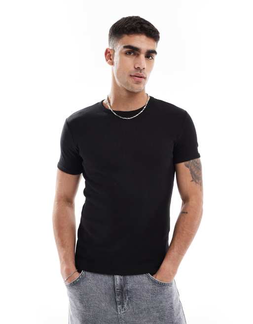 Bershka – Svart, ribbad t-shirt med korta ärmar