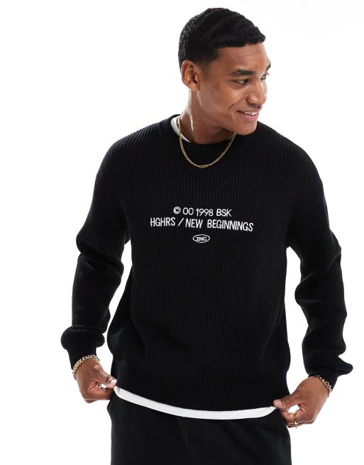 Bershka – Svart, ribbstickad tröja med tryck framtill