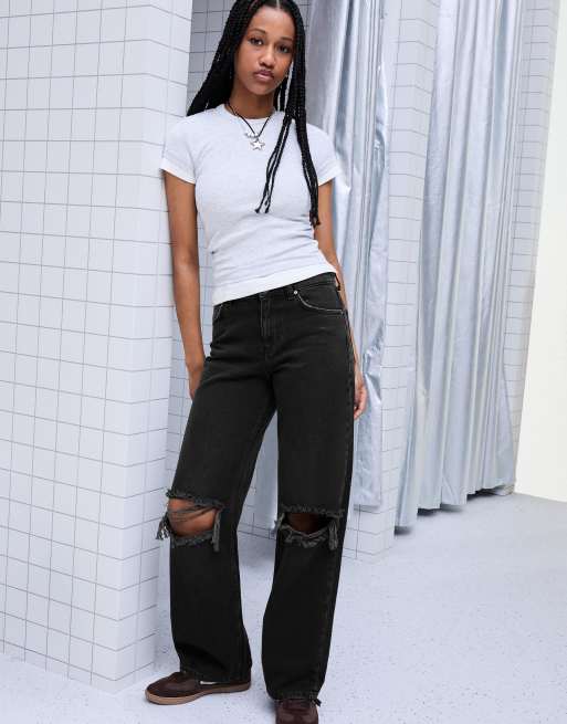 Bershka – Svarta jeans med hög midja, vida ben och revor