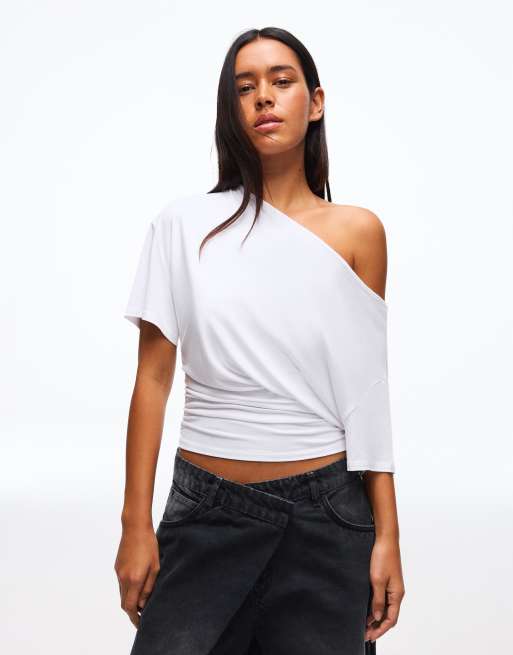 Bershka – Vit, asymmetrisk t-shirt med korta ärmar
