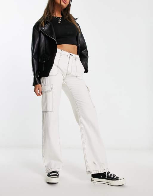 Bershka – Vita, baggy cargojeans med hög midja och kontrastfärgade sömmar