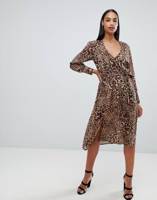 Boohoo – Leopardmönstrad långärmad omlottklänning i midilängd