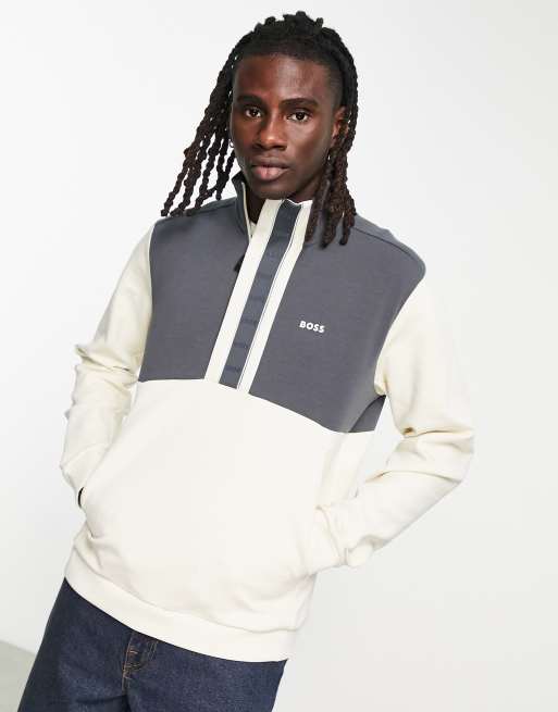 BOSS – Green Sweat 1 – Naturvit och marinblå sweatshirt med 1/4-lång dragkedja och tejpade detaljer