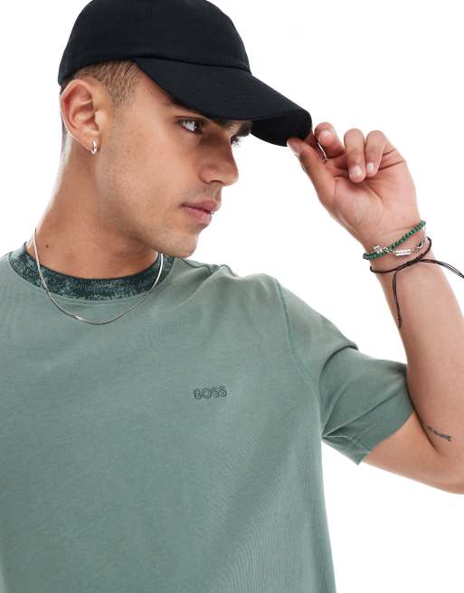 BOSS Orange – Grön t-shirt med ribbad, kamouflagemönstrad krage