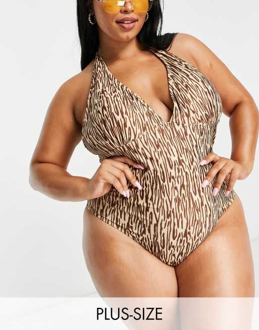 Brave Soul Plus – Brun djurmönstrad baddräkt med halterneck