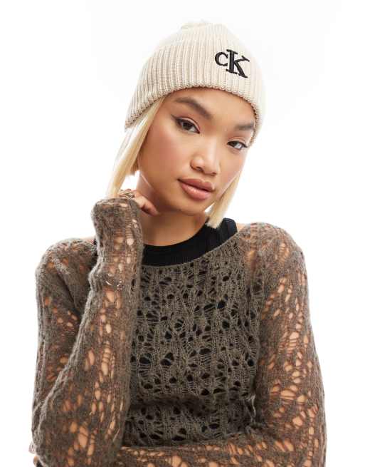 Calvin Klein Jeans – Gräddvit mössa med logga och tofs