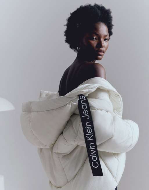 Calvin Klein Jeans – Vit kort pufferjacka med dragsko och logga