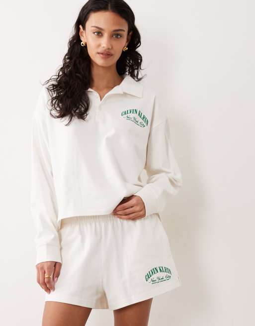 Calvin Klein – Gräddvit sweatshirt i jersey med pikékrage och logga, del av set