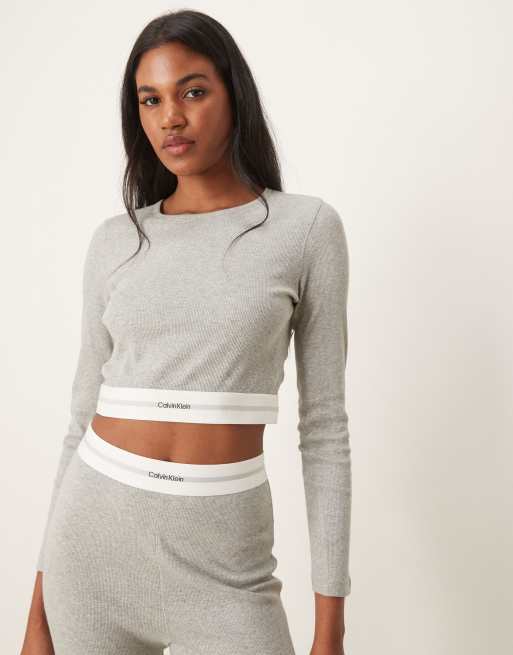 Calvin Klein – Modern – Grå, ribbad och kort topp med långa ärmar