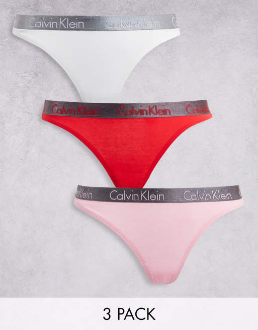 Calvin Klein – Radiant Cotton – Vita, rosa och röda stringtrosor i bomull med metallic-logga på midjebandet, 3-pack