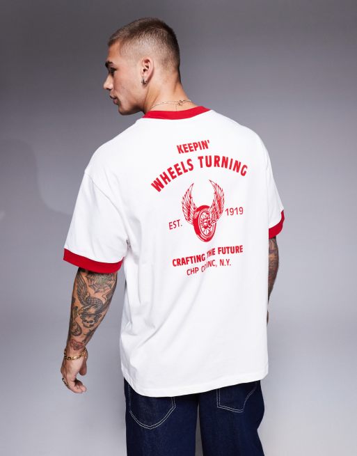 Champion – Rochester – Naturvit och röd t-shirt med kantrand och tryck baktill