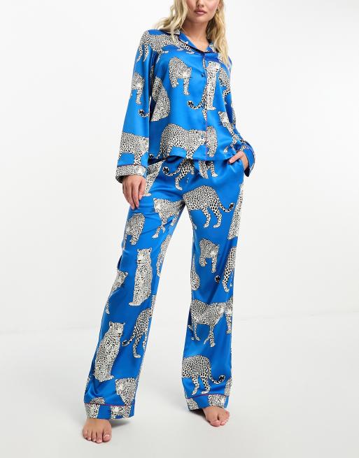 Chelsea Peers – Exklusivt – Premium – Koboltblå, leopardmönstrad pyjamas i velour med topp med platt krage och byxor
