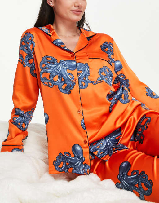 Chelsea Peers – Orange bläckfiskmönstrad pyjamas i premiumsatin med överdel med kragslag och byxor
