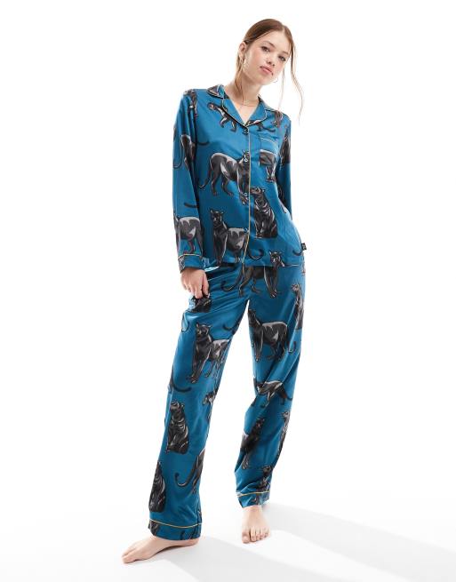 Chelsea Peers – Skogsgrön pyjamas i satin med knappförsedd skjorta och byxor