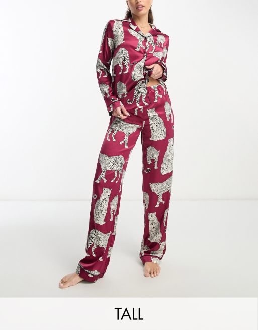 Chelsea Peers Tall – Premium – Vinröd och leopardmönstrad pyjamas i satin med topp med platt krage och byxor