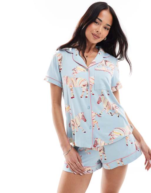 Chelsea Peers – Zebramönstrad pyjamas i polymaterial med kortärmad topp med platt krage och shorts