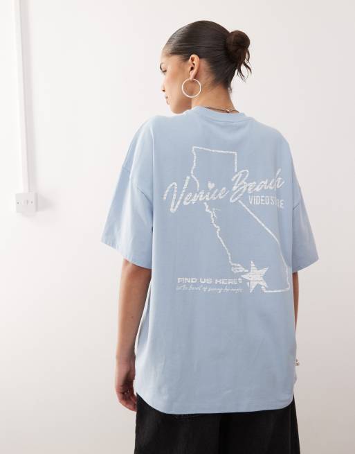 COLLUSION – Blå, kraftig t-shirt med Venice Beach-tryck