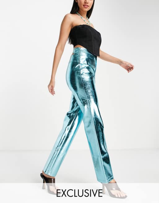 COLLUSION – Blå metalliska byxor i läderimitation med raka ben