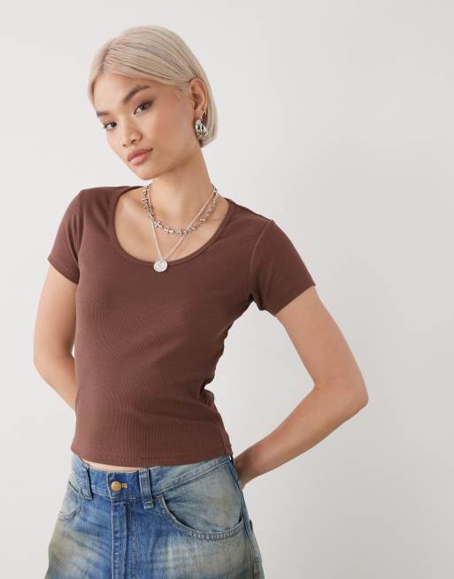 COLLUSION – Brun, ribbad topp med korta ärmar och djup halsringning