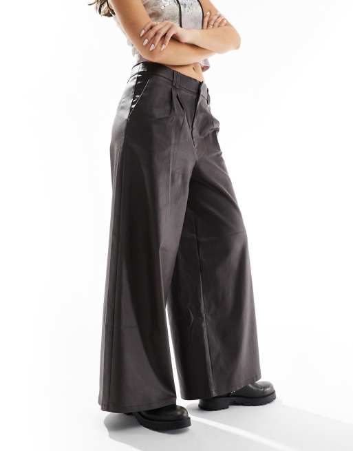 COLLUSION – Bruna byxor med vida ben och beläggning i PU