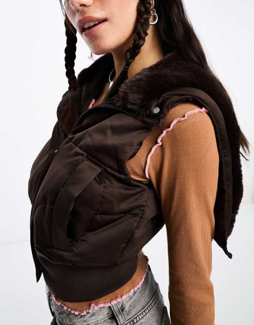 COLLUSION – Chokladbrun hybridväst i satin med fuskpälshuva i milleniestil