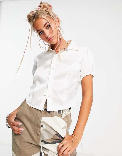 COLLUSION – Gräddvit kort satinskjorta i retrostil med logga