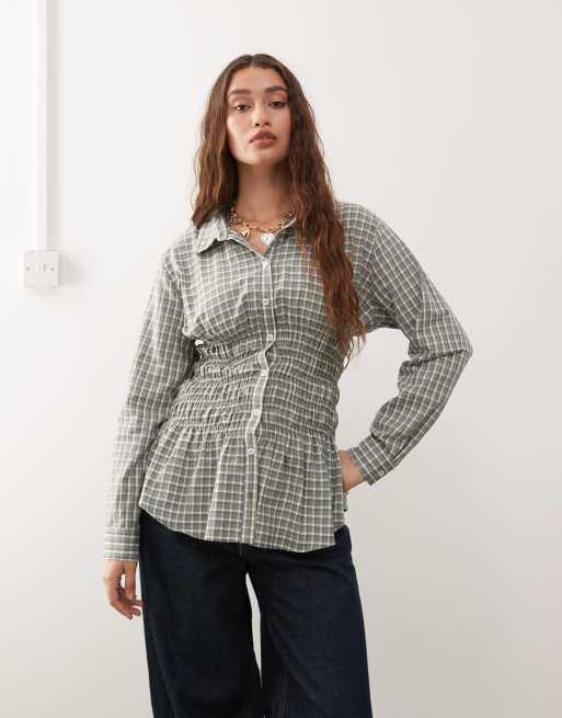 COLLUSION – Grön, smockad skjorta med långa ärmar och rutigt mönster