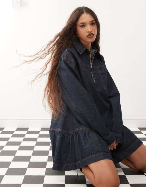 COLLUSION – Indigoblå, smockad miniklänning i denim