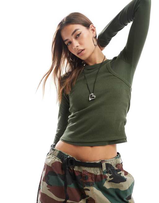 COLLUSION – Kakifärgad topp med två lager och lång ärm