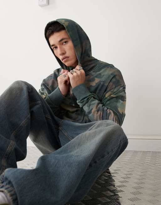 COLLUSION – Kamouflagemönstrad, huvtröja med boxig passform och tryck i tunn jersey