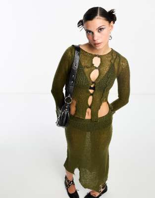 COLLUSION – Khakifärgad hålstickad kofta med slitningar, del av set