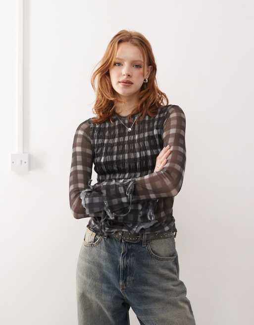 COLLUSION – Långärmad topp i mesh med rysch och suddigt, rutigt mönster