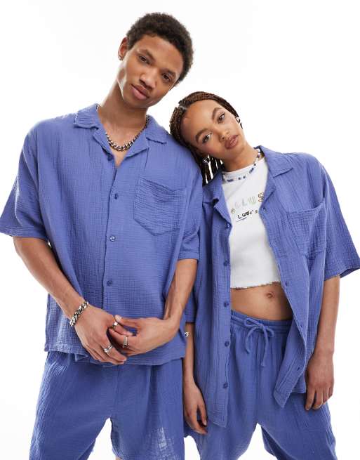 COLLUSION – Lavendelblå, strukturerad skjorta i oversize med korta ärmar, krage med slag och råskuren detalj