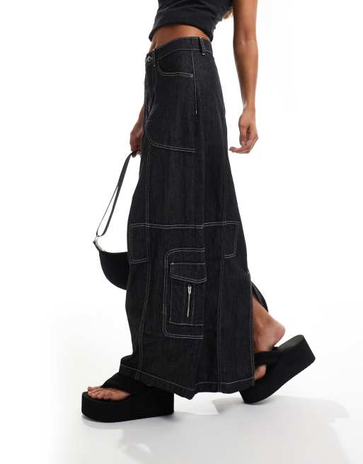 COLLUSION – Maxikjol i tunn denim med kontrastfärgade sömmar