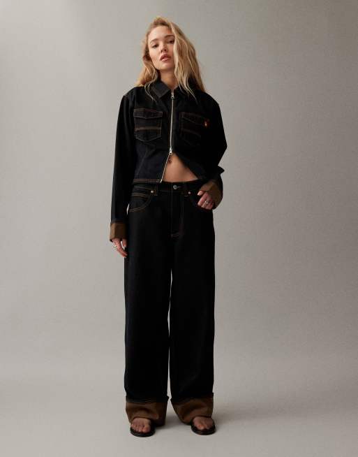 COLLUSION – Mörkblå jeans med medelhög midja och orange, kontrastfärgad, uppvikt fåll