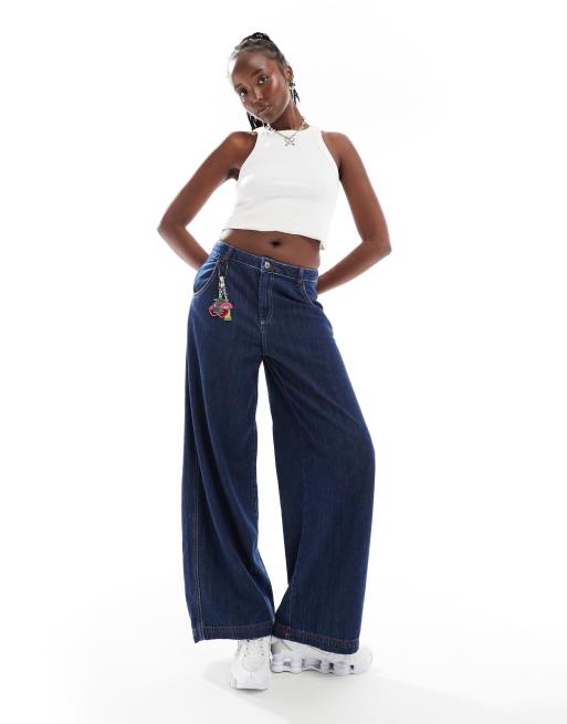 COLLUSION – Mörkblå, sköljtvättade baggy jeans i skatestil med kontrastfärgade sömmar