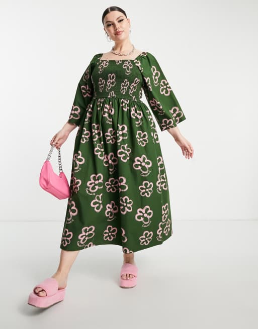 COLLUSION Plus – Grön lång smockklänning med blommor och vida ärmar