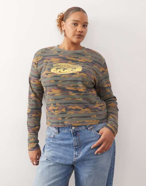 COLLUSION – Plusstorlek – Kamouflagemönstrad topp med våffeltextur och långa ärmar