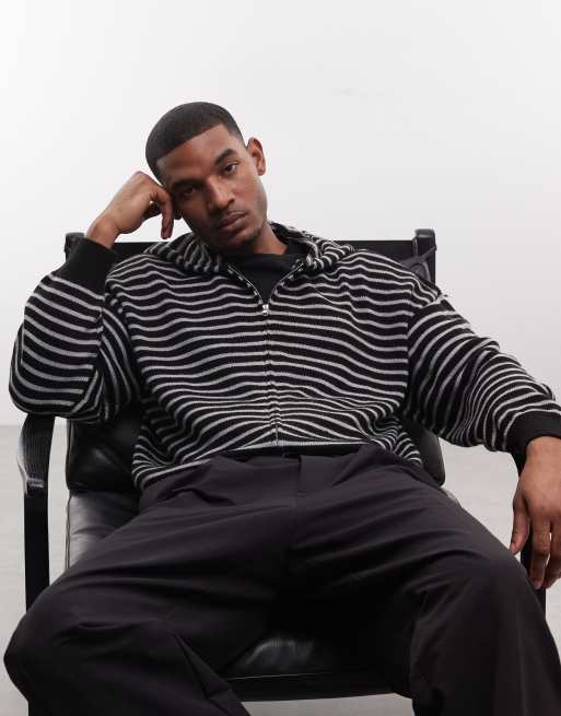 COLLUSION – Svart, randig, stickad huvtröja med boxig passform och dragkedja
