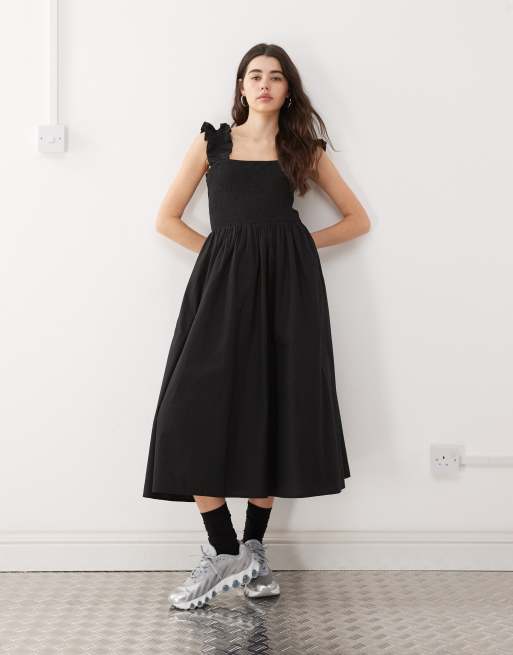 COLLUSION – Svart, vävd midiklänning med ryschade axelband