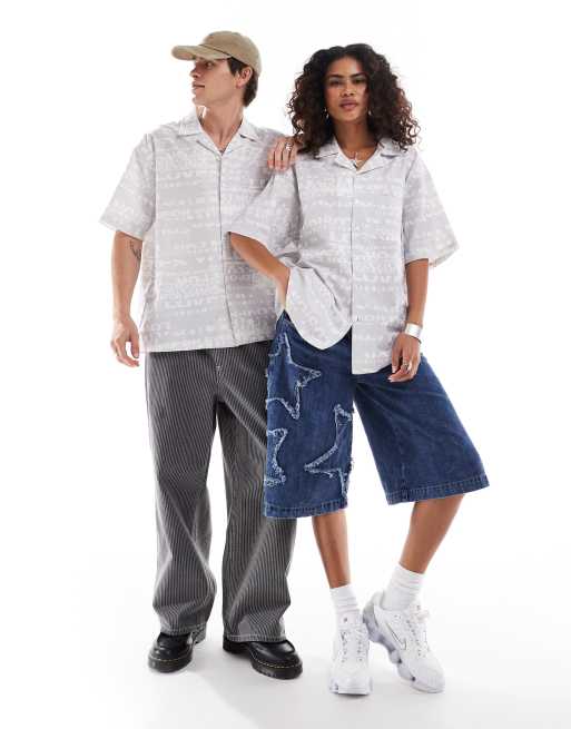 COLLUSION Unisex – Grå, nyhetsmönstrad, vävd skjorta med platt krage i bomull