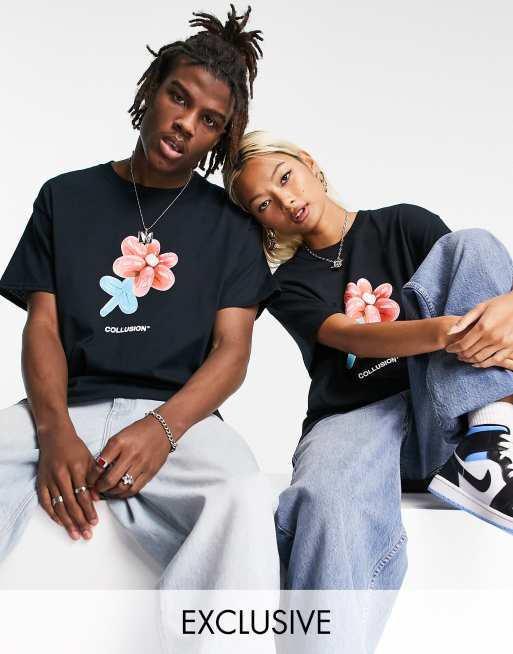 COLLUSION Unisex – Svart t-shirt med ballongblomma