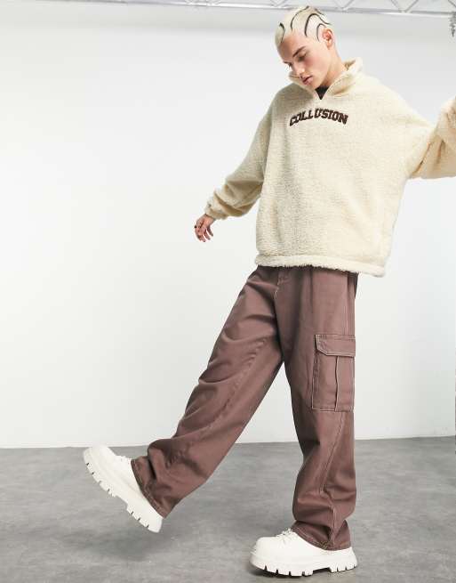 COLLUSION x015 – Mockabruna cargojeans med kontrastsöm och antifit-passform