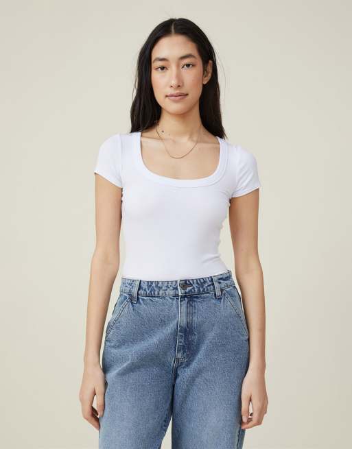 Cotton On – Essential – Vit ribbad t-shirt med djup halsringning