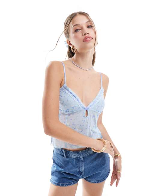 Cotton On – Blå, småblommig, kort pyjamastopp i mesh