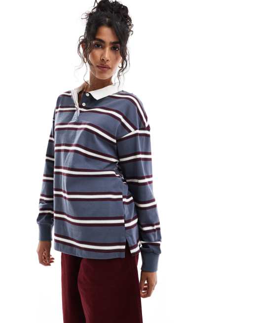 Cotton On – Blårandig rugbytröja med långa ärmar och pikékrage