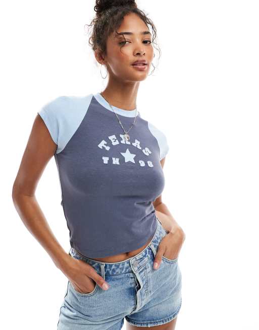 Cotton On – Collegeblå raglan-t-shirt i retrostil med tryck