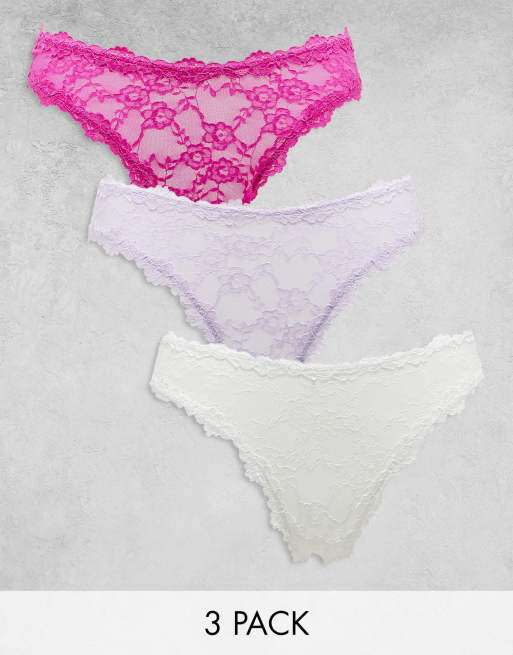 Cotton On – Ljuslila, rosa och gräddvita stringtrosor i stretchig spets, 3-pack
